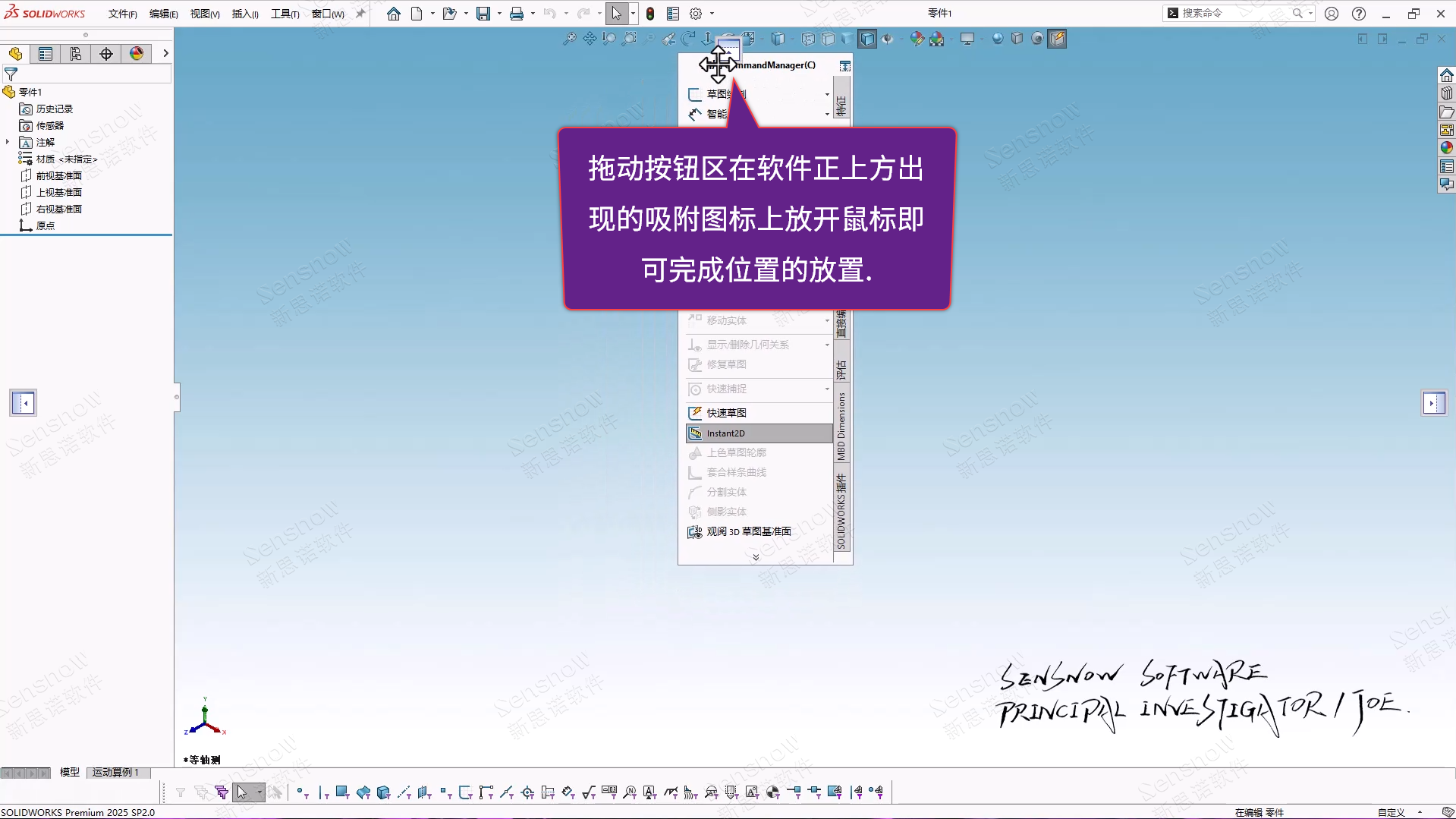 此处为 SOLIDWORKS 2021 版本增强功能【可折叠的CommandManager】,此功能与我们 Office 文档同理,是一个折叠功能区,为了展现更大的绘图区域,让不同习惯的用户可以自由切换。由 CommandManager 按钮区域页面右下角的小按钮进行控制;