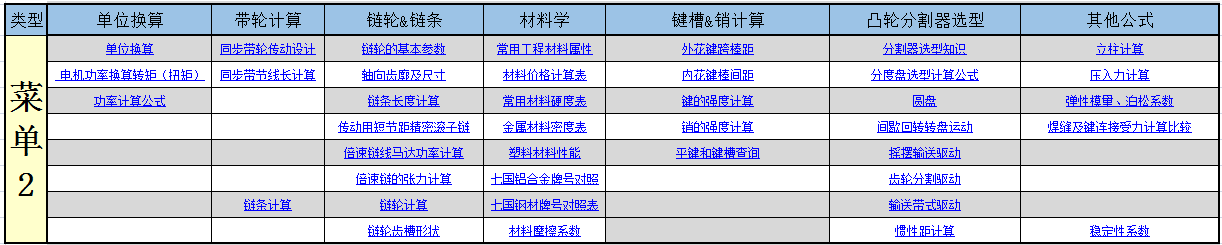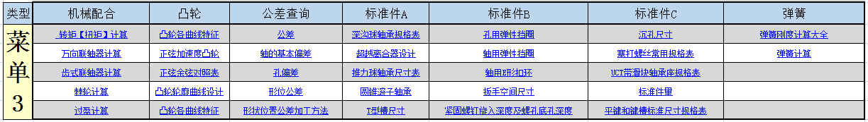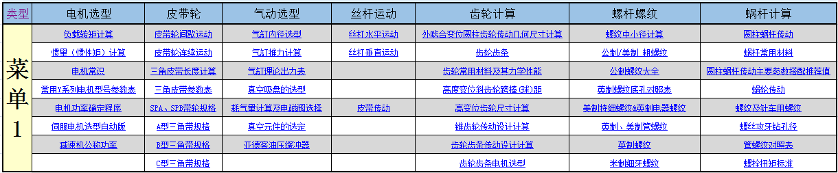 非标机械设计综合查询表将常用的机构图纸、设计技巧、电机选型、气缸选型、皮带轮、齿轮计算、凸轮分割器选型、公差查询、带轮计算表集合在一起,方便设计师快速查找,提高设计效率!