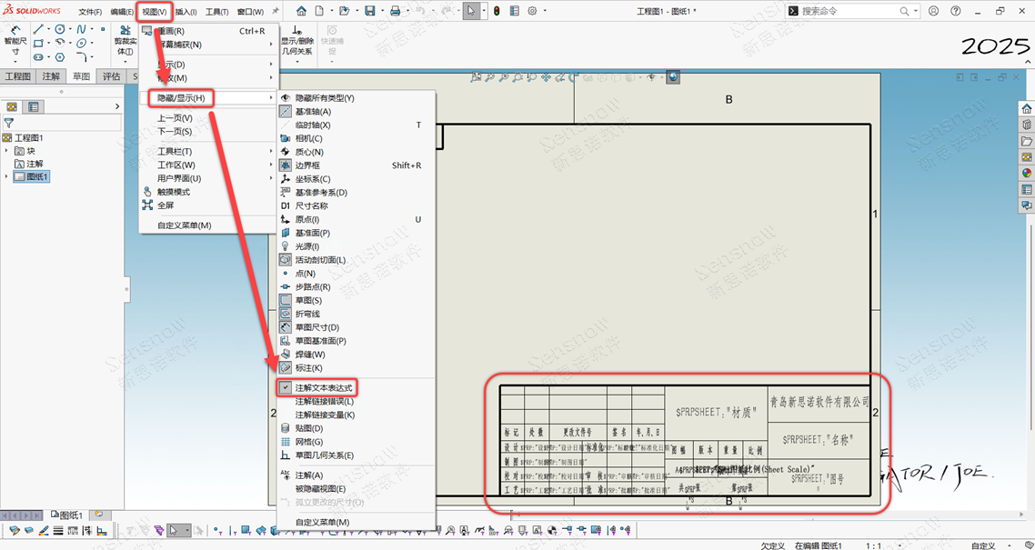 在 SOLIDWORKS 2025 SP 2 版本中增加了这项开关,视图下拉列表 -> 隐藏/显示 -> 注解文本表达式;