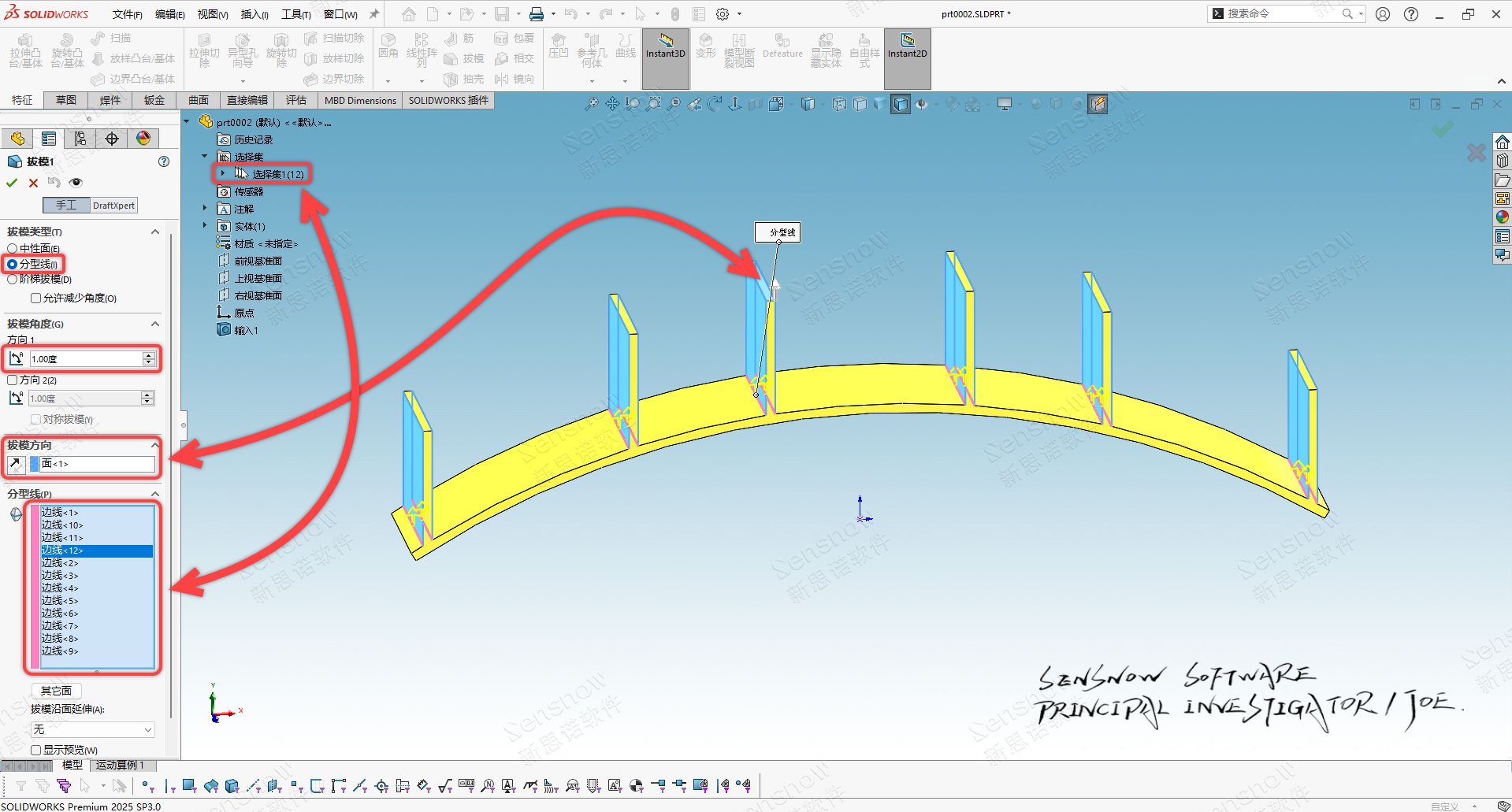 我们 SOLIDWORKS 中的拔模功能的确没有沿枢轴拔模的选项(绕轴心),但我们有分型线拔模的功能,且存在选择集的功能(SOLIDWORKS 2015版本增加的),利用选择集可以大大减少用户在拔模过程中频繁手动去选取模型元素的动作,可提升选取的效率和选取的准确性!且可为模型后续的设计更改提供更多的可用性。