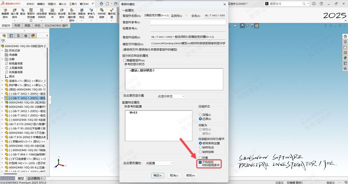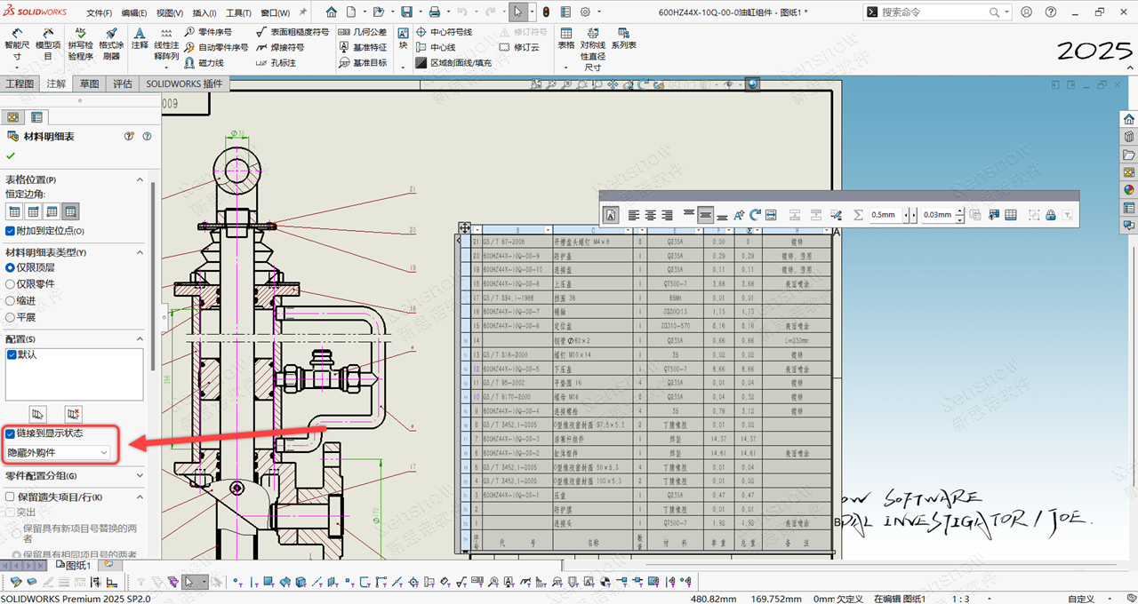现在在 SOLIDWORKS 2025 SP 1 版本中已经解决了这一难题,允许我们将 BOM 与三维模型的“显示状态”进行关联。那么此时就可以做到既可以在工程制图的图形表达中显示这些外购件/参考件/标准件,又可以让 BOM 仅统计我们需要的自制件。
