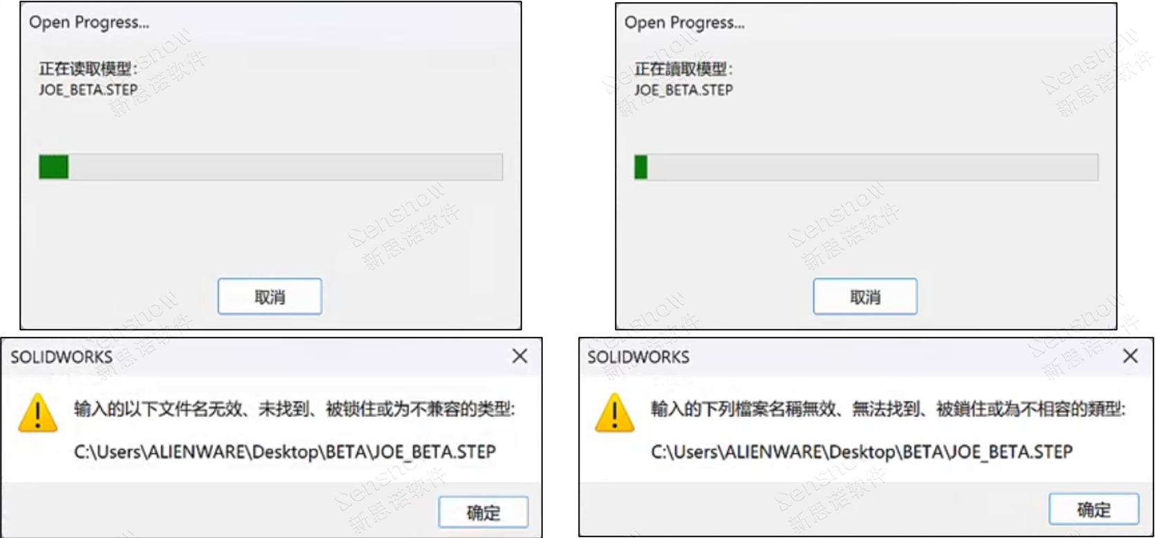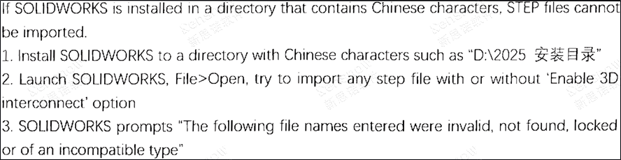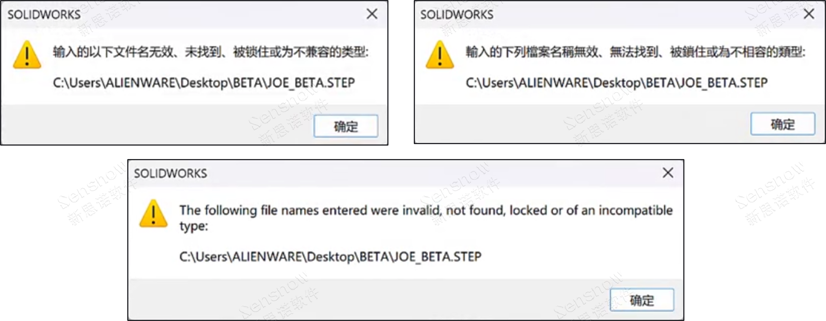 在 SOLIDWORKS 2024 或 2025 版本中导入 STEP 时出现:输入的以下文件名无效、未找到、被锁住或为不兼容的类型!